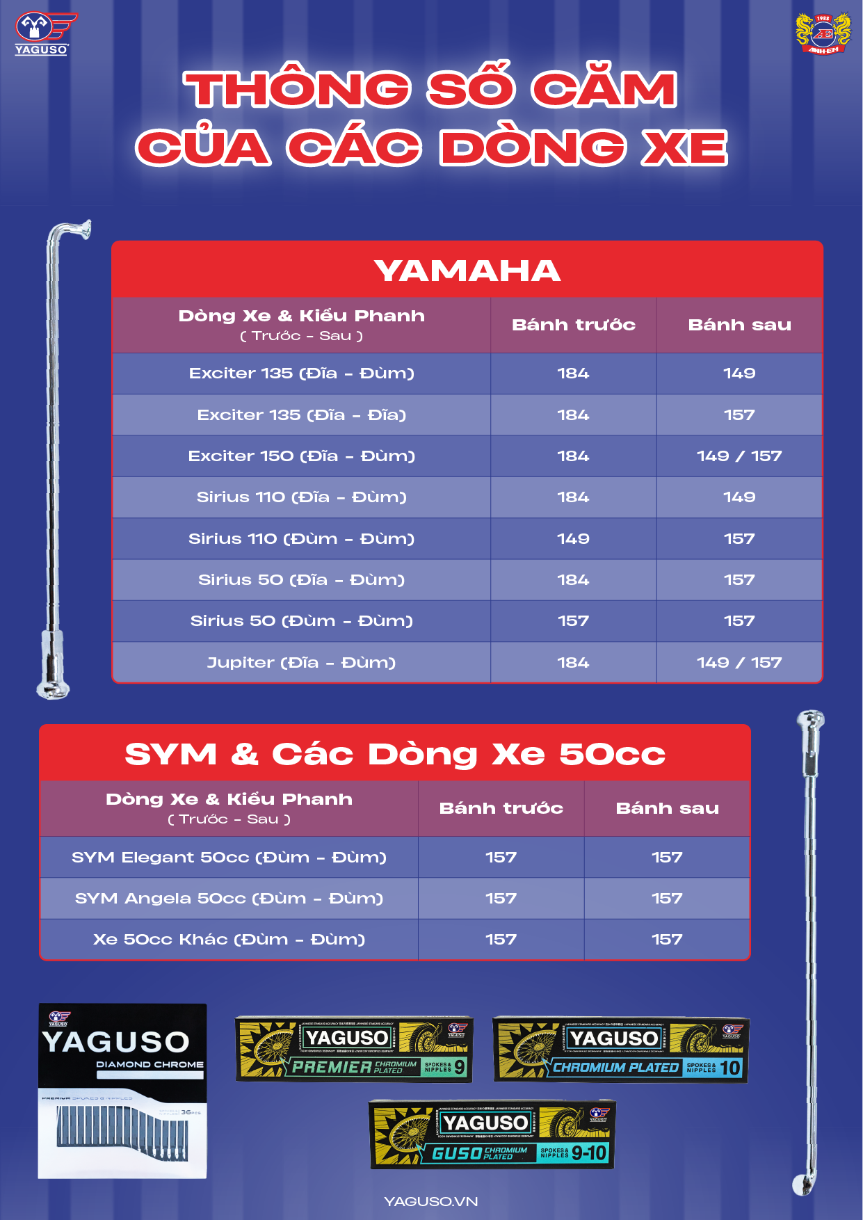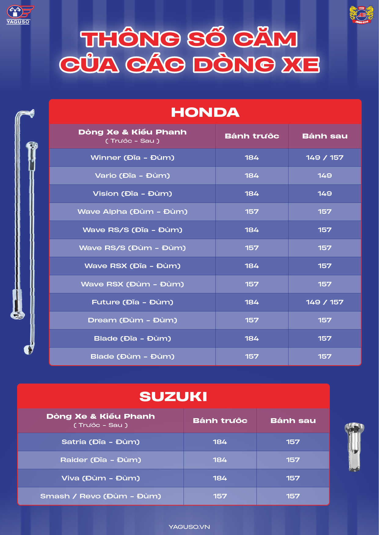 Chúng tôi tự hào cung cấp căm Yaguso tương thích với hầu hết các dòng xe phổ biến trên thị trường, từ Honda, Yamaha đến Suzuki, SYM và các dòng xe 50cc. Dưới đây là bảng tổng hợp chi tiết thông số căm Yaguso cho từng dòng xe, giúp bạn dễ dàng tra cứu và lựa chọn sản phẩm phù hợp nhất.